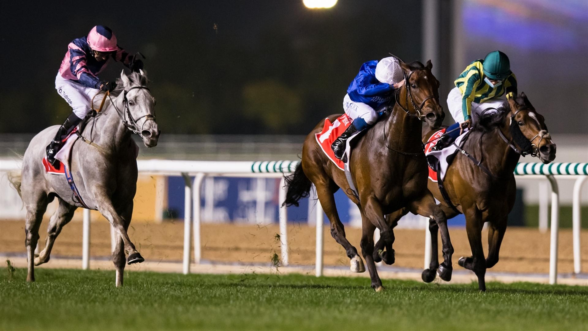 Bochart (GB) (Satish Seemar – Richard Mullen) wins the Al Furjan at the third Dubai World Cup Carnival race meeting on January 16, 2020. (Credit: Dubai Racing Club // Erika Rasmussen).