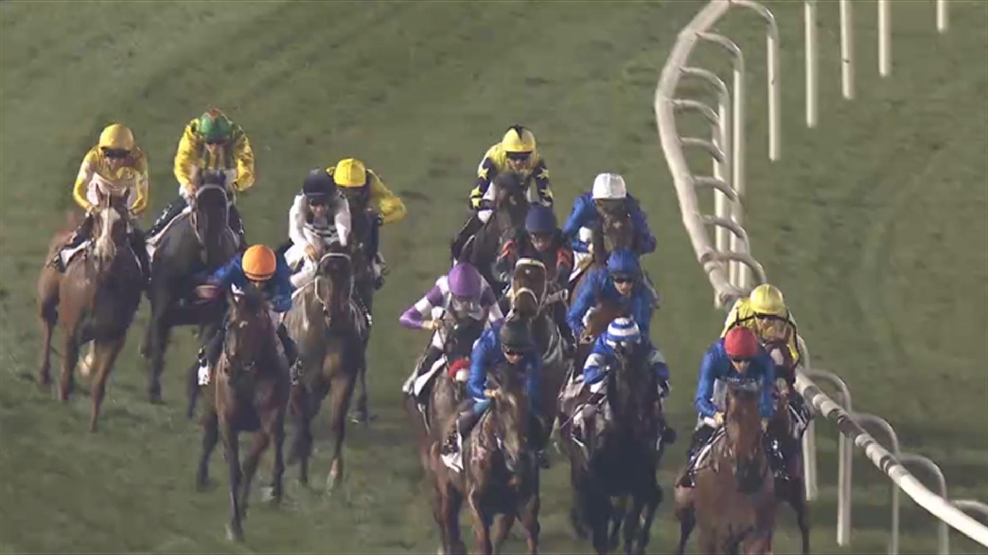 Monoski (USA) (Salem bin Ghadayer – Mickael Barzalona) wins the Longines Spirit Collection Trophy – 1600m, dirt race at the ninth Racing at Meydan meeting on February 13, 2021. (Credit: Dubai Racing Club // Erika Rasmussen)