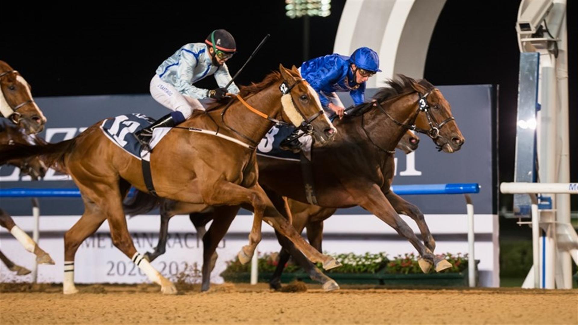 Commanding (IRE) (Satish Seemar – Richard Mullen) wins the UAE 2000 Guineas Trial Presented By Longines Dolce Vita at the second Dubai World Cup Carnival race meeting on January 09, 2020. (Credit: Dubai Racing Club // Erika Rasmussen)